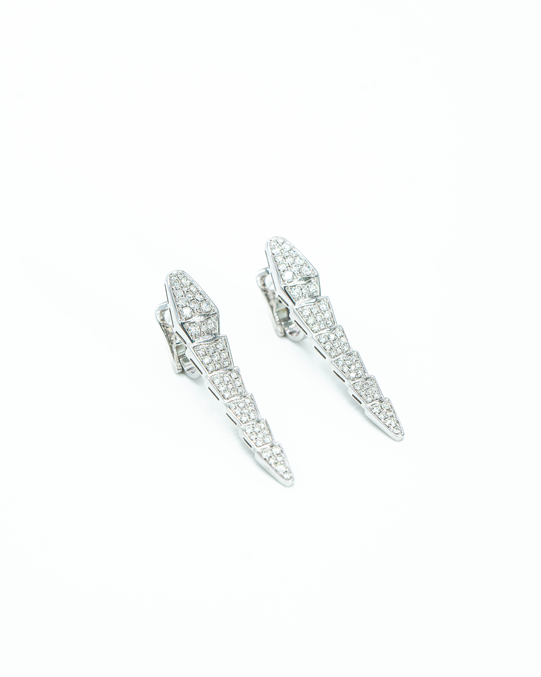 Exude bold elegance with the Serpenti Viper Diamond Earrings, a striking design that captures the spirit of luxury and contemporary sophistication. Each earring features a sinuous serpentine motif adorned with 112 meticulously set round brilliant-cut diamonds, creating a captivating sparkle from every angle.