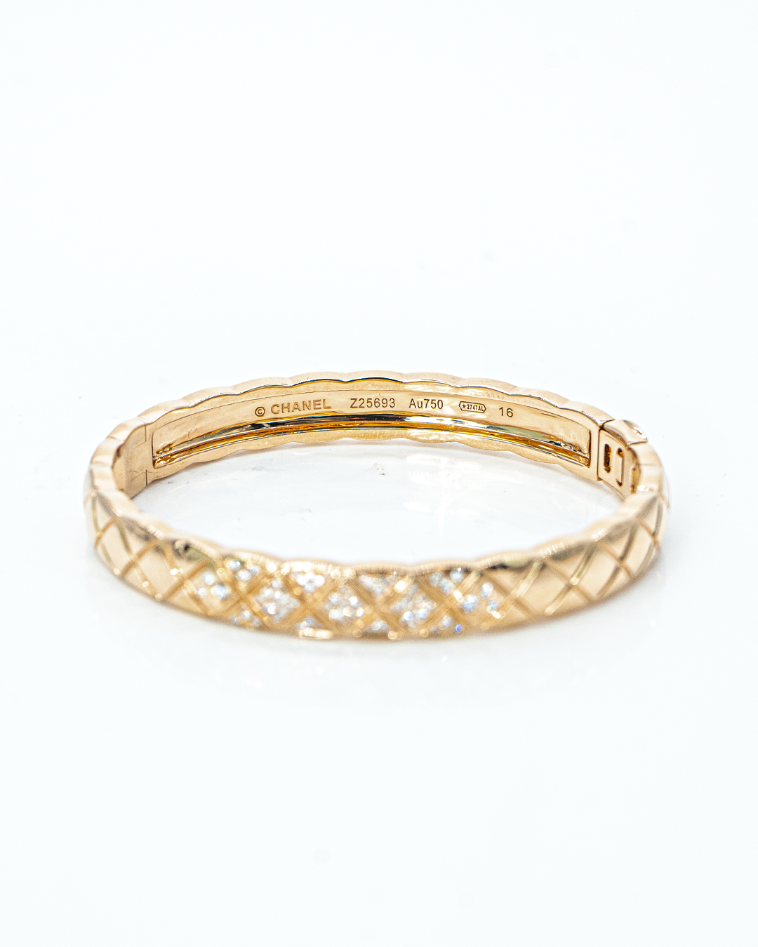 The Yellow Gold Matelassé Bracelet combines contemporary design with refined elegance. Expertly handcrafted, it features 8 diamonds totaling 0.09 CTS and 73 diamonds totaling 0.193 CTS, arranged in a textured matelassé-inspired pattern that enhances its sparkle and sophistication. Its polished yellow gold finish and meticulous craftsmanship make it a versatile statement piece for both everyday wear and special occasions.