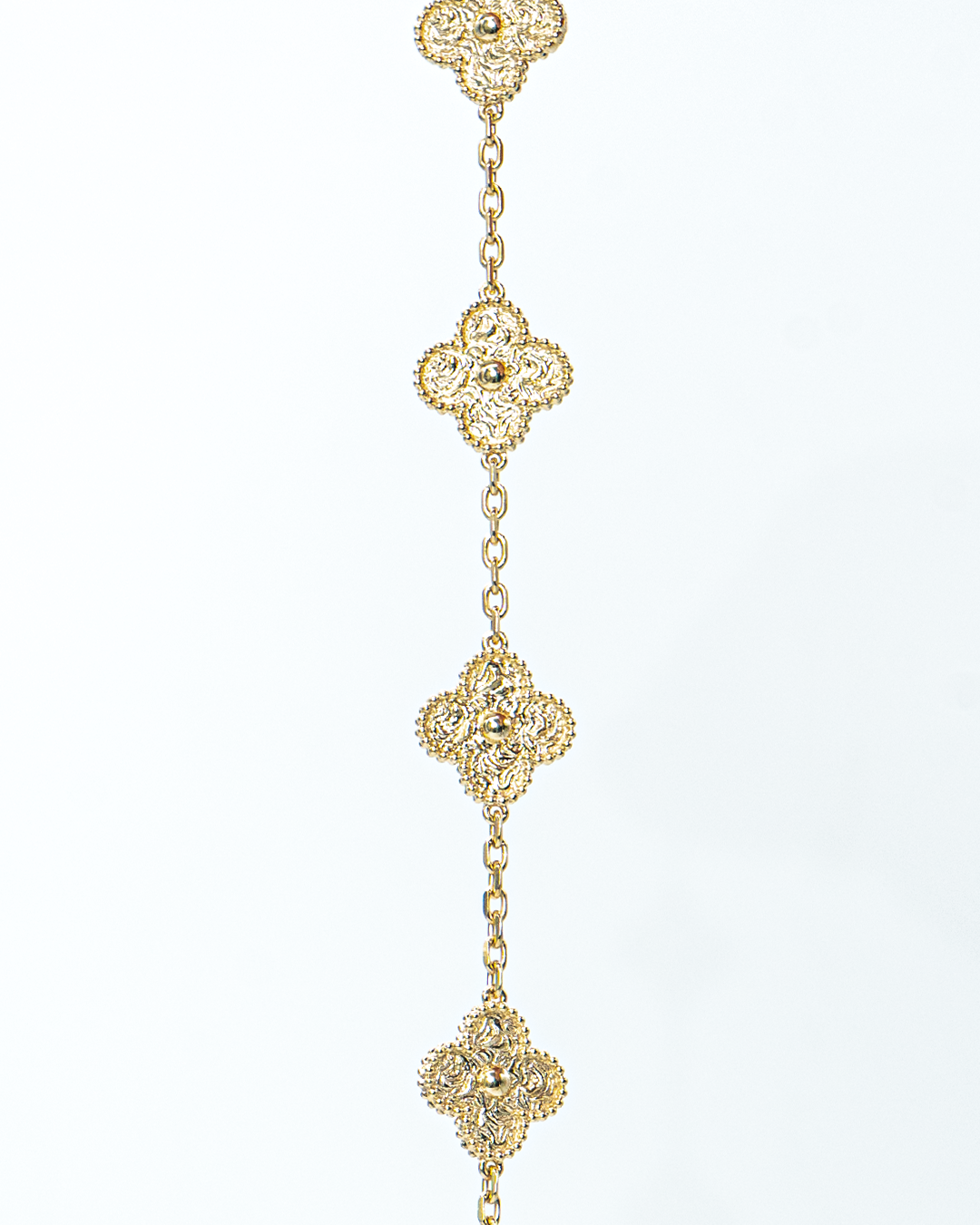 The Golden Quatrefoil Link Bracelet captures the essence of classic elegance with a contemporary touch. Beautifully handcrafted, this piece features interlocking quatrefoil motifs — a timeless symbol of harmony and good fortune. Its polished gold finish and refined craftsmanship make it a versatile accessory that transitions effortlessly from day to night. Perfect for adding a subtle yet sophisticated glow to any ensemble.