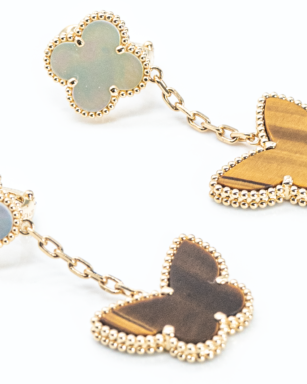 Celebrate elegance and whimsy with the Lucky Alhambra Papillon Drops, a refined design that combines the iconic Alhambra motif with the delicate form of a butterfly. Each earring is adorned with 2.9 CTS of high-quality gemstones, creating a luminous and captivating sparkle.