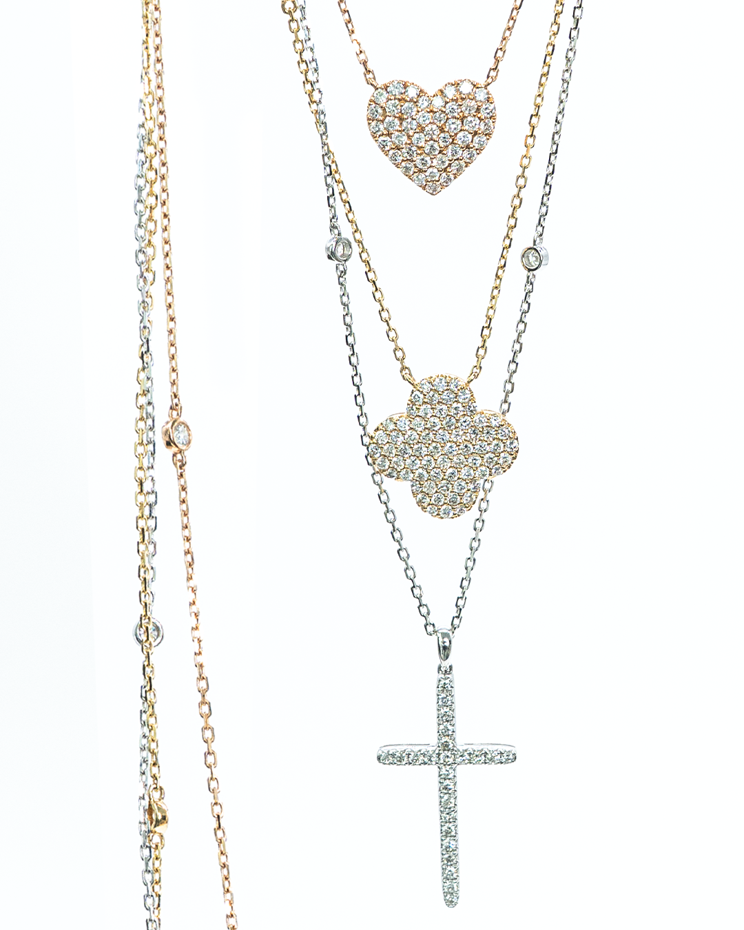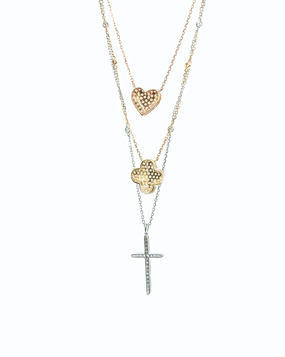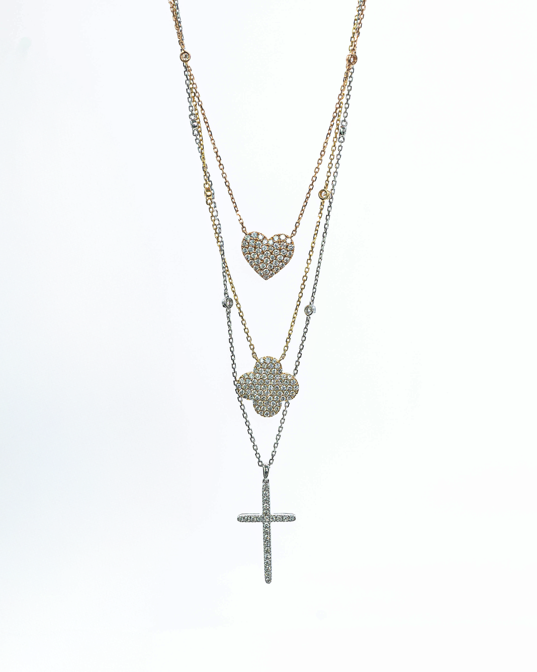 Radiate sophistication with the Celestial Trinity Diamond Necklace, a stunning piece that combines timeless elegance with contemporary design. This necklace features 142 round brilliant-cut diamonds totaling 1.85 CTS, meticulously set to create a harmonious and radiant display of sparkle.