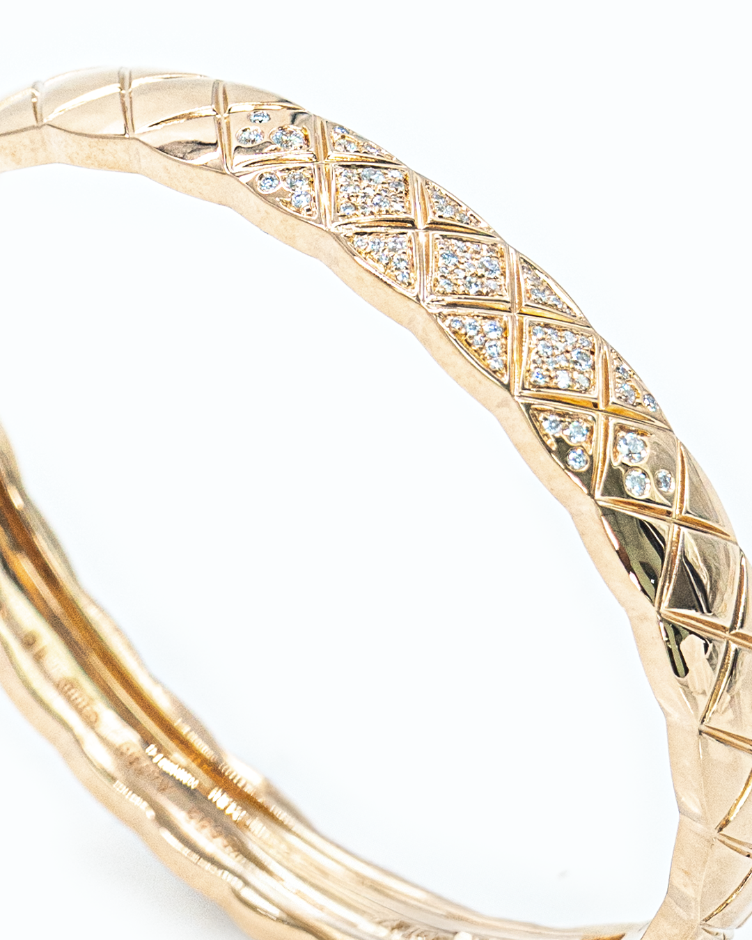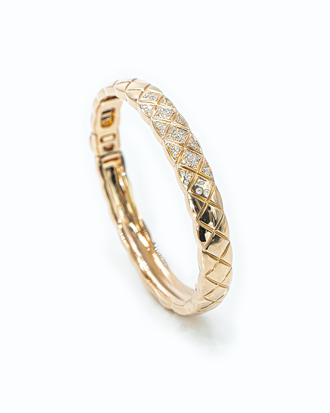 The Yellow Gold Matelassé Bracelet combines contemporary design with refined elegance. Expertly handcrafted, it features 8 diamonds totaling 0.09 CTS and 73 diamonds totaling 0.193 CTS, arranged in a textured matelassé-inspired pattern that enhances its sparkle and sophistication. Its polished yellow gold finish and meticulous craftsmanship make it a versatile statement piece for both everyday wear and special occasions.