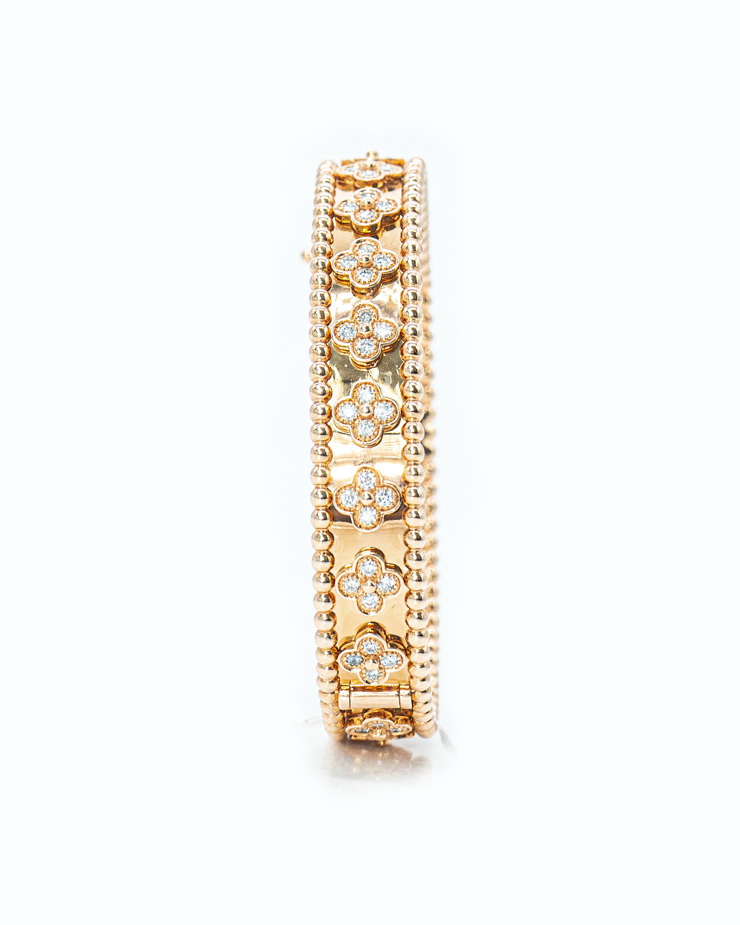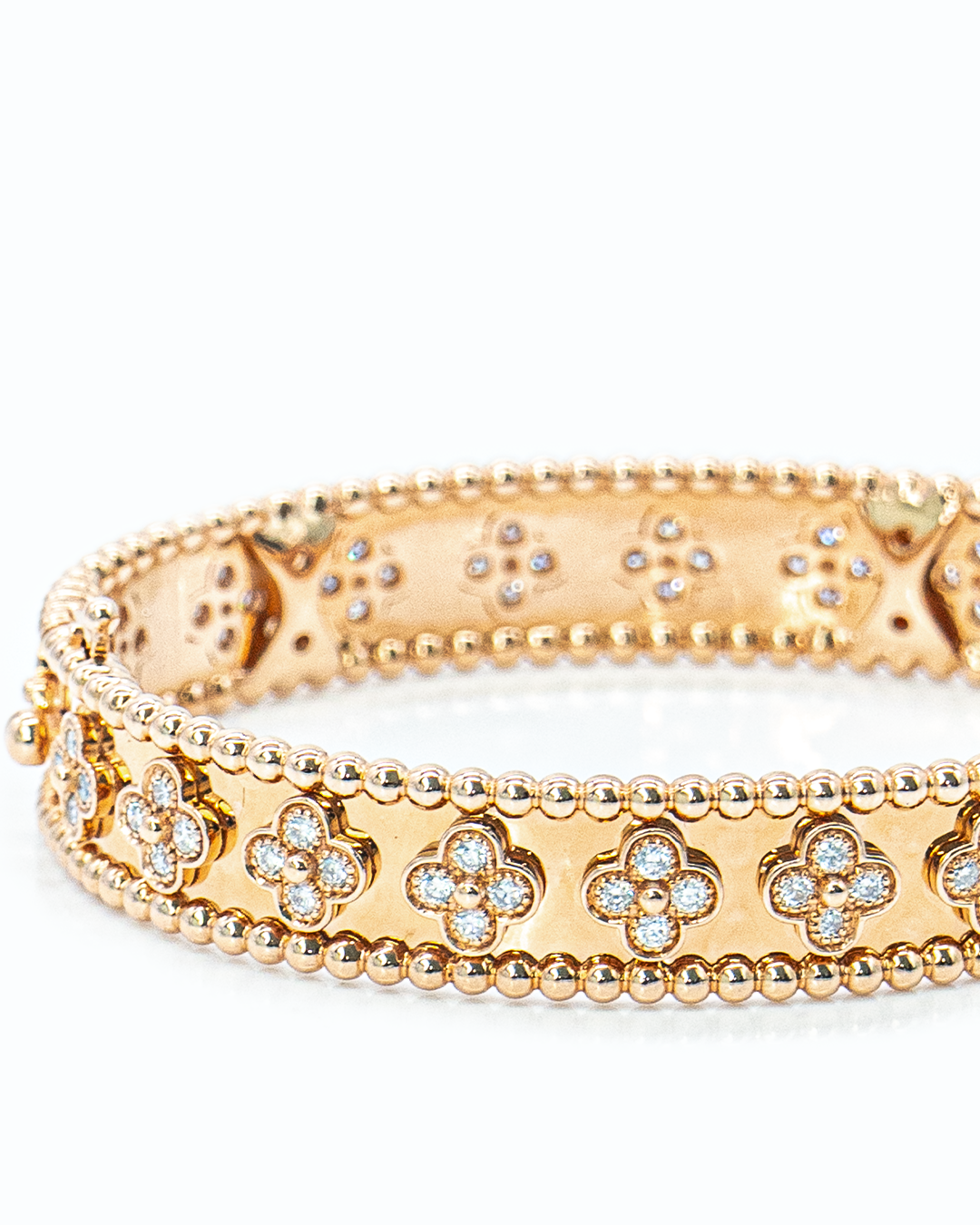 The Perlée Clover Rose Gold Bracelet combines refined craftsmanship with a touch of romantic elegance. Expertly handcrafted, it features 80 round-cut diamonds totaling 1.761 CTS, delicately set within a clover-inspired design that symbolizes luck and sophistication. Its polished rose gold finish enhances its warm, luxurious appeal, making it a standout piece for both everyday elegance and special occasions.