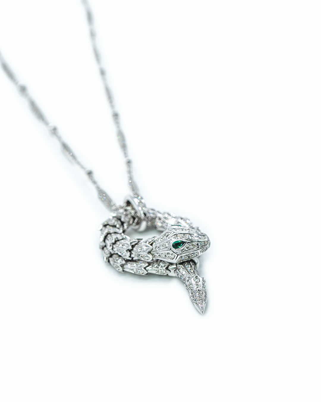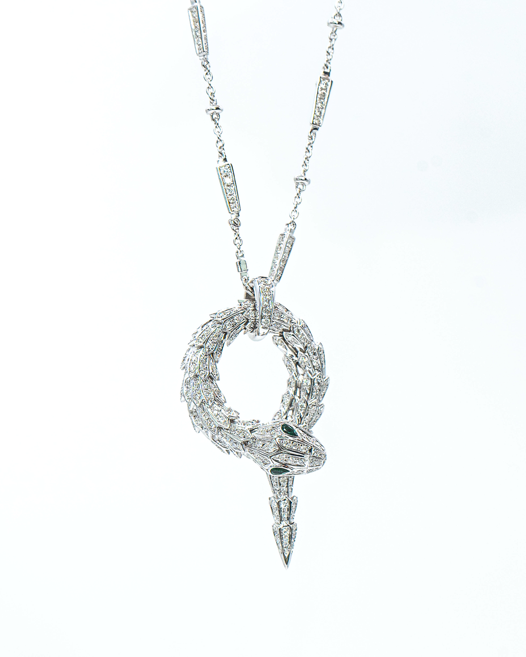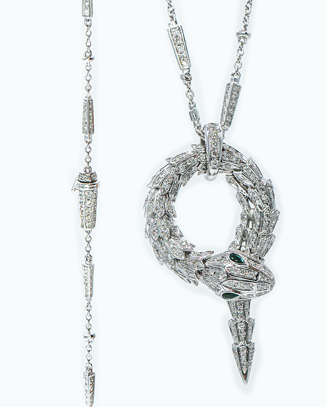 Exude dramatic elegance with the Serpent's Kiss Necklace, a striking design that combines the brilliance of diamonds with the allure of vibrant emeralds. This necklace features 399 round brilliant-cut diamonds totaling 3.543 CTS, G-H color, SI clarity, complemented by 2 stunning emerald green gemstones, creating a luxurious and captivating display.