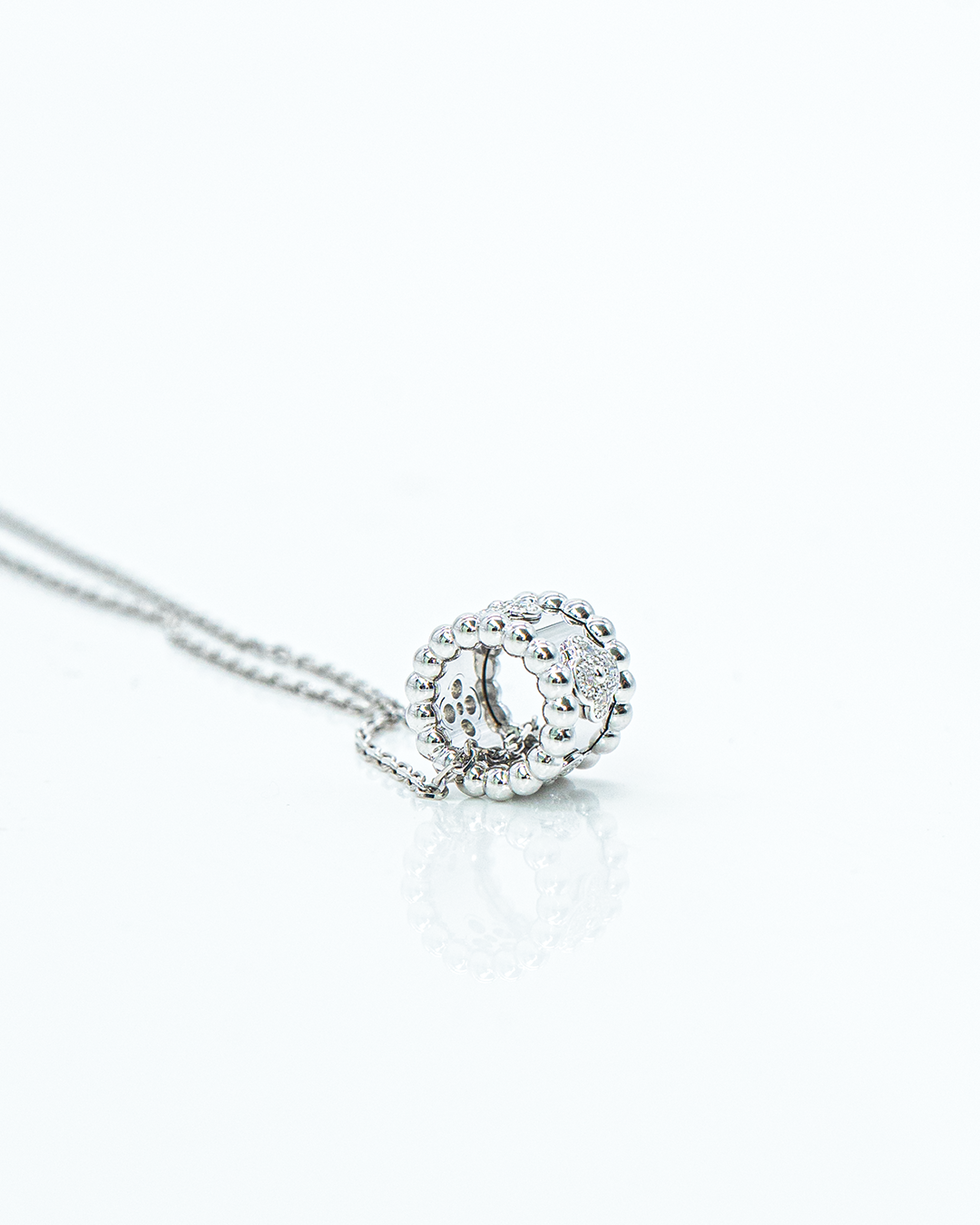 Celebrate timeless elegance with the Alhambra Barrel Necklace, a refined piece that combines classic design with subtle sparkle. This necklace features 16 round brilliant-cut diamonds totaling 0.184 CTS, meticulously set along a barrel-inspired motif for a graceful and luminous effect.