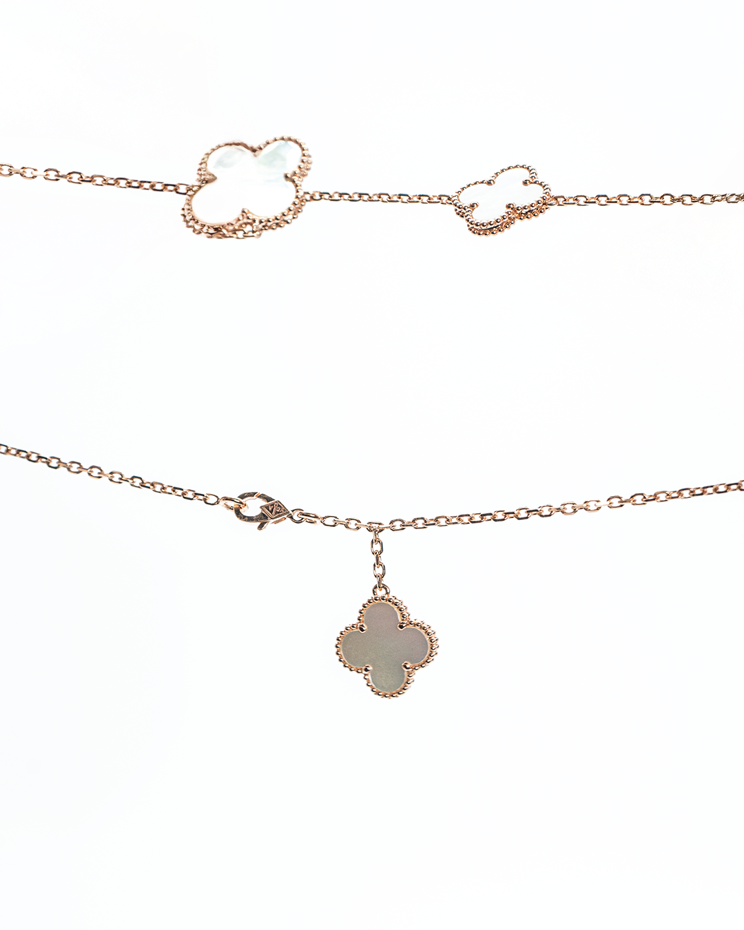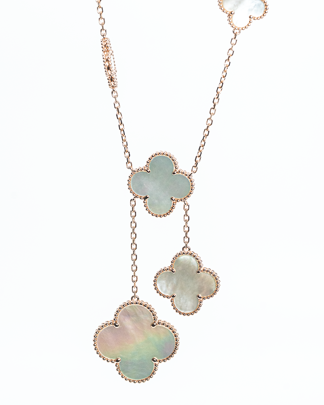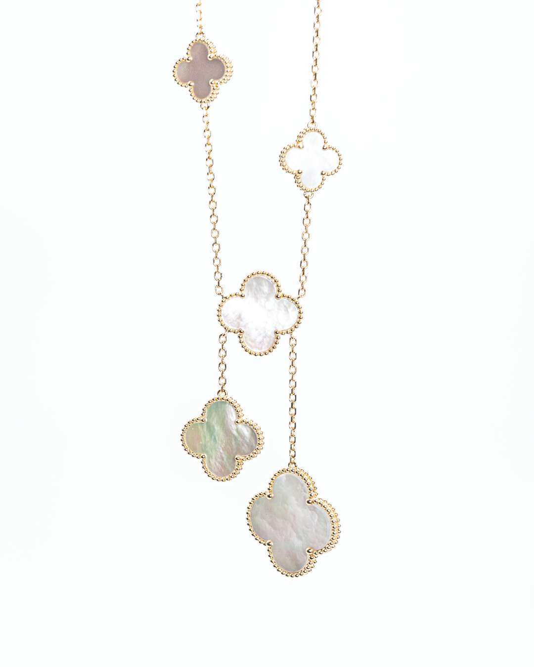 Expertly handcrafted for lasting beauty, the necklace has a net weight of 16.49 GM (gross weight 22.07 GM), making it perfect for statement-making occasions or elevating any sophisticated ensemble. The Alhambra Cascade Necklace embodies timeless luxury, intricate artistry, and versatile elegance.