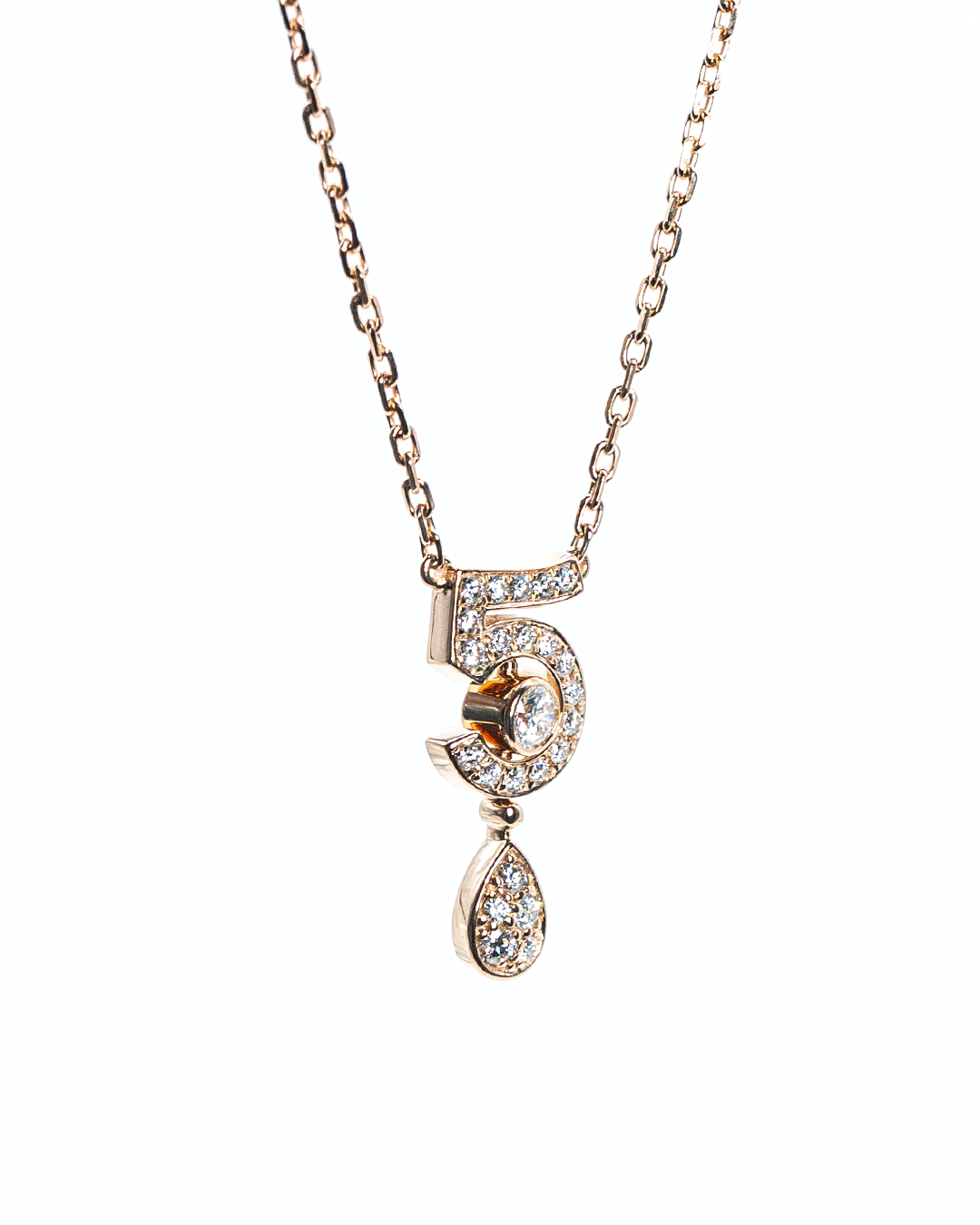 Exude iconic elegance with the Chanel Number Five Necklace, a sophisticated piece that combines timeless design with sparkling brilliance. This necklace features 25 round brilliant-cut diamonds totaling 0.374 CTS, meticulously set to create a luminous and refined display.