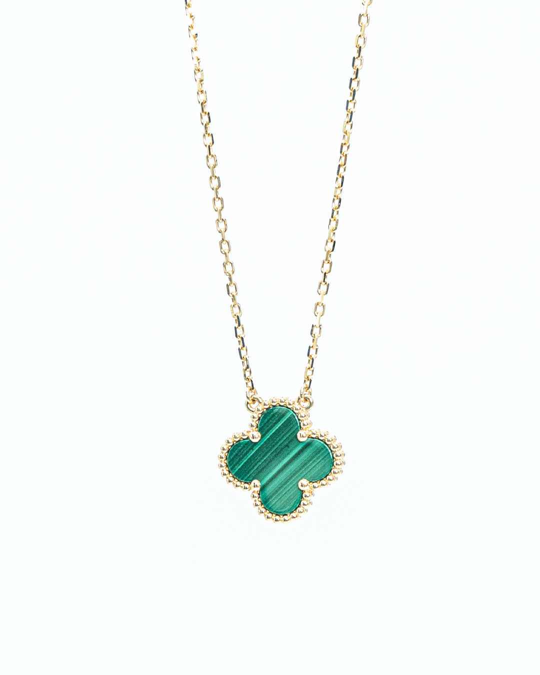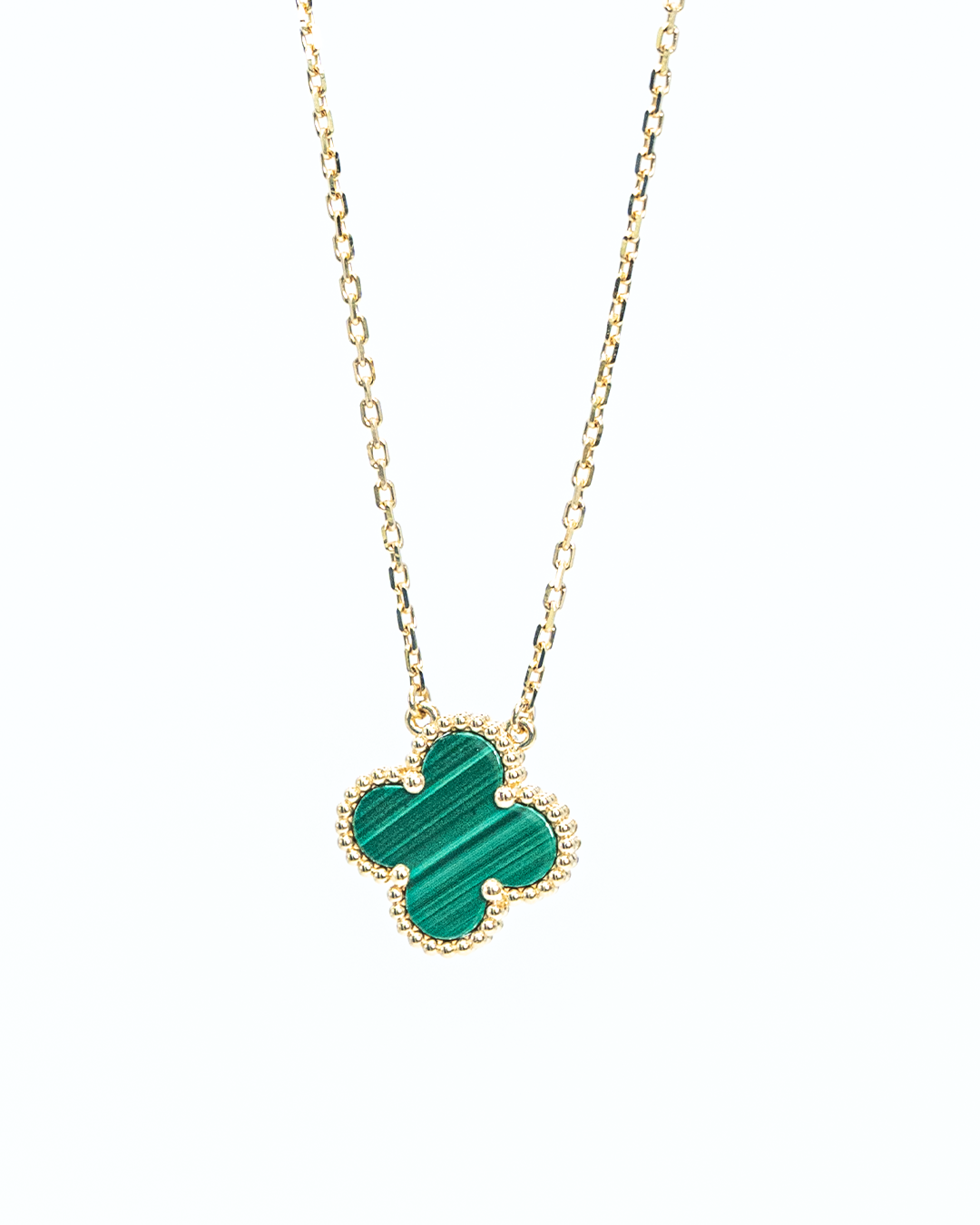 Exude vibrant elegance with the Malachite Alhambra Pendant, a refined piece that highlights the natural beauty of malachite in a classic Alhambra-inspired design. This pendant features 1 flower-shaped green gemstone totaling 0.75 GM, set to create a luminous and captivating display.